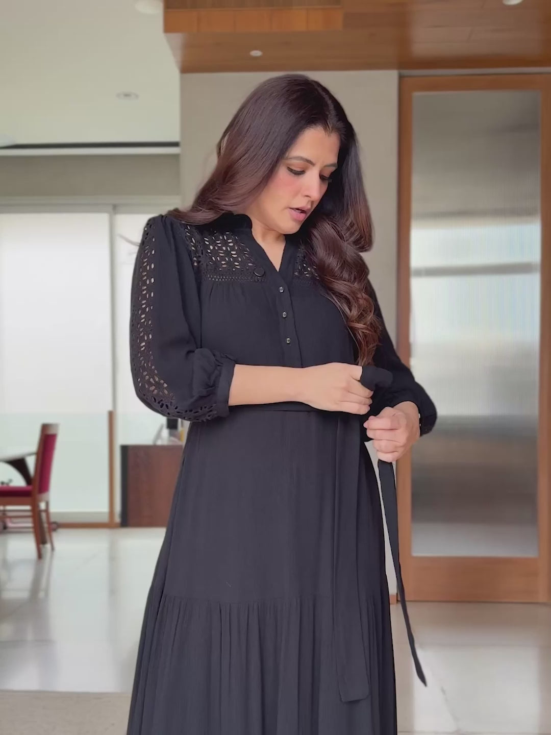 - Lace detail, Self fabric belt tie up, Tiered bottom, Lined with 100% cotton