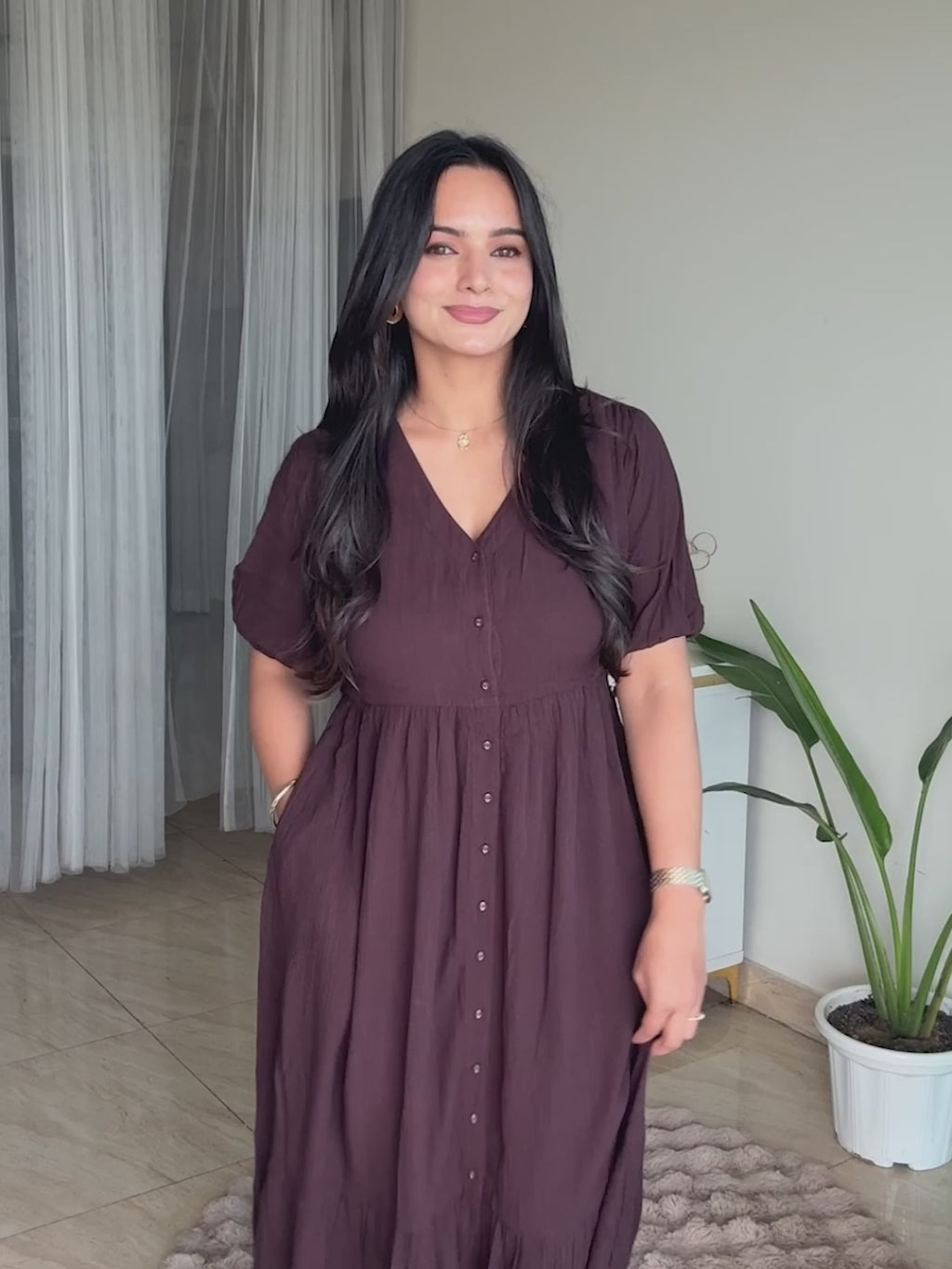- Button down placket, tiered bottom, self fabric tie up belt